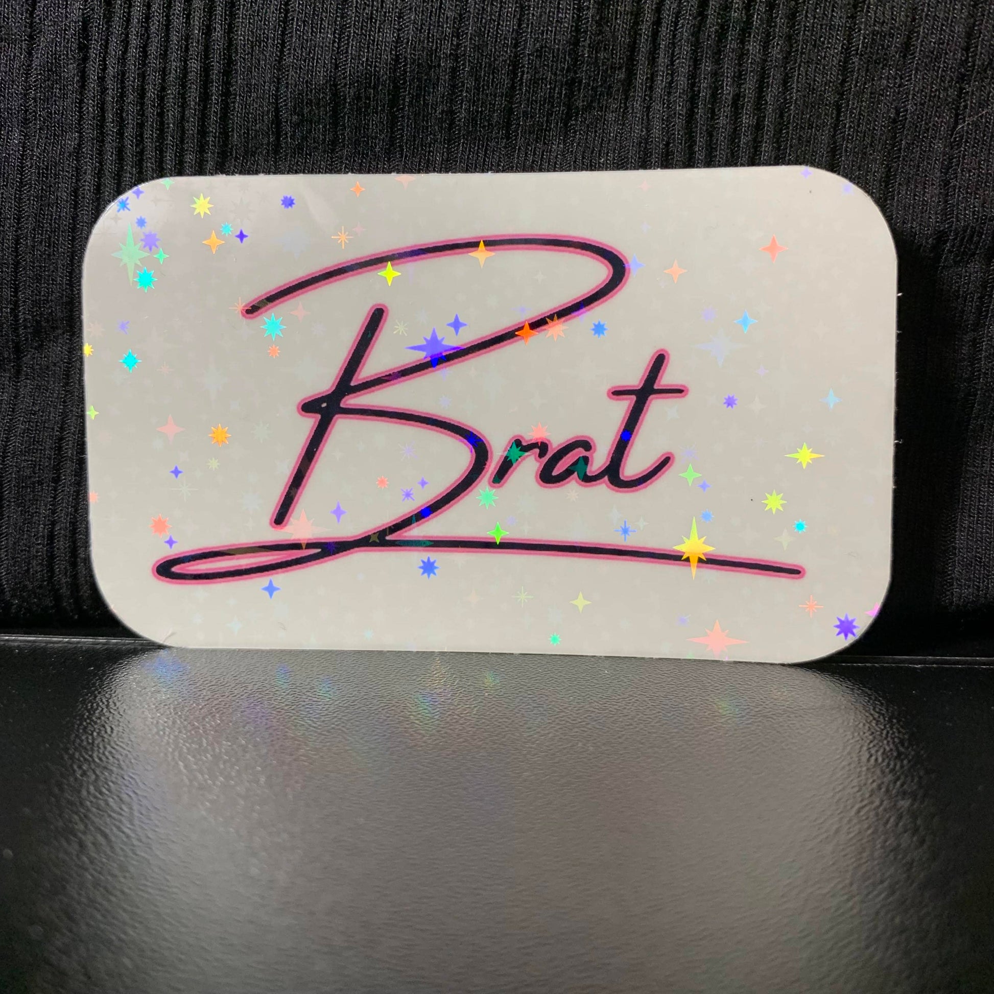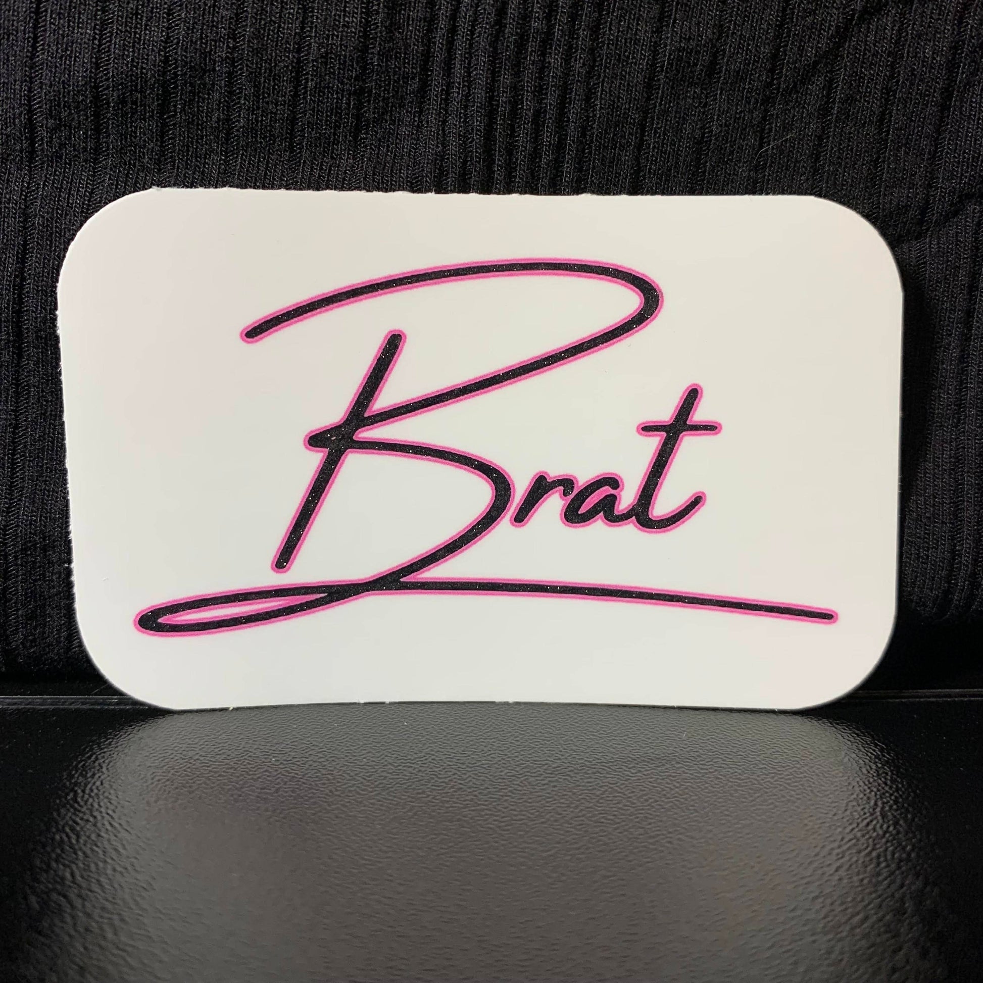 "Brat" black with pink outline sticker. Vinyl and waterproof with laminate, plus optional glitter detail.