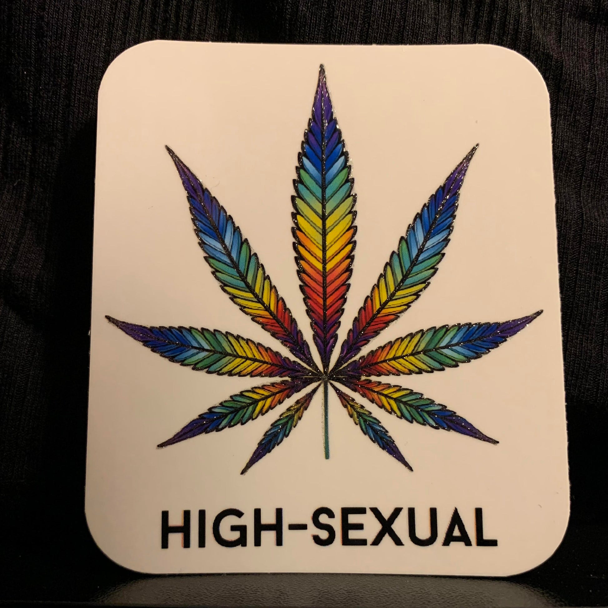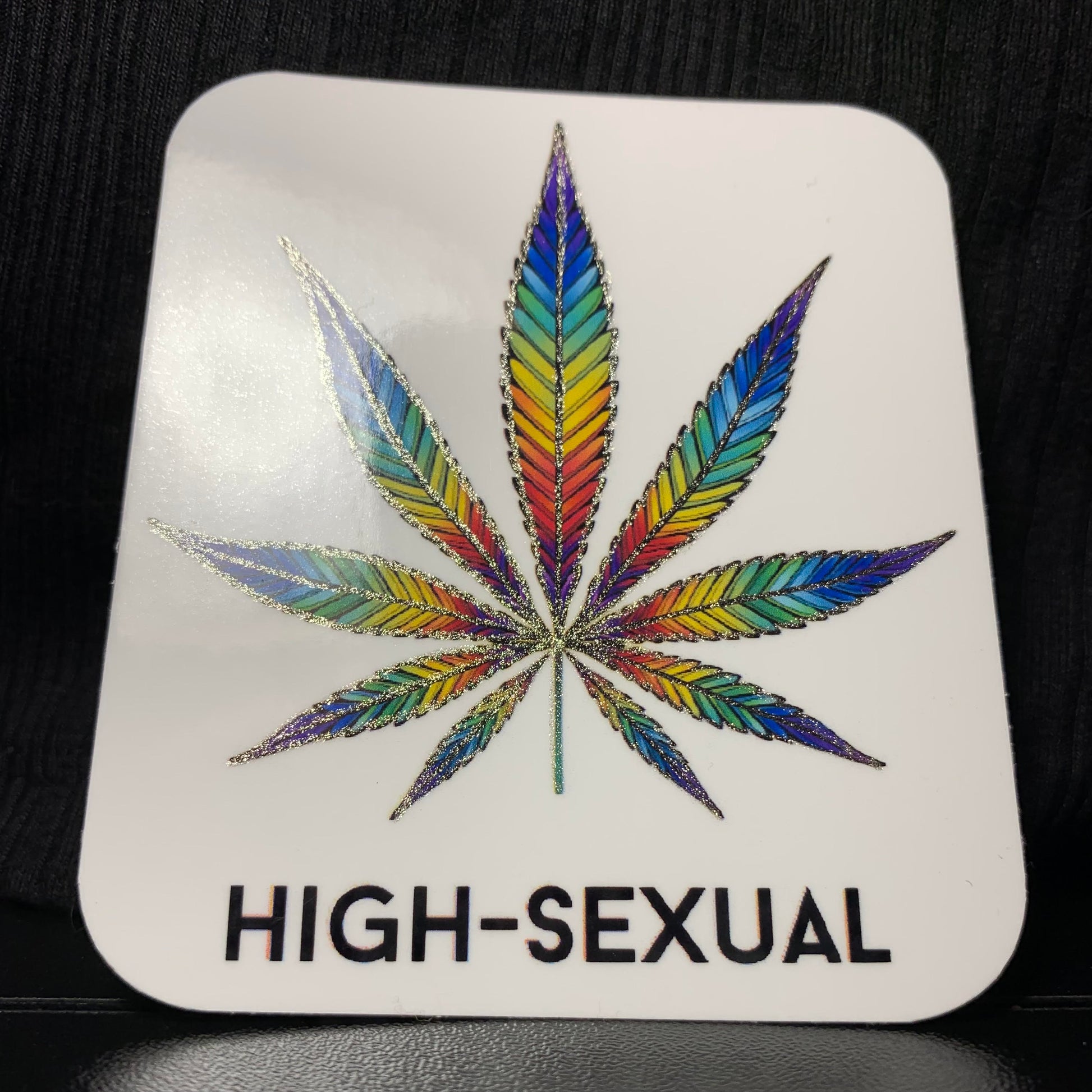 "High-Sexual" sticker with rainbow pot leaf, outlined in glitter (check out second picture). Vinyl and waterproof.