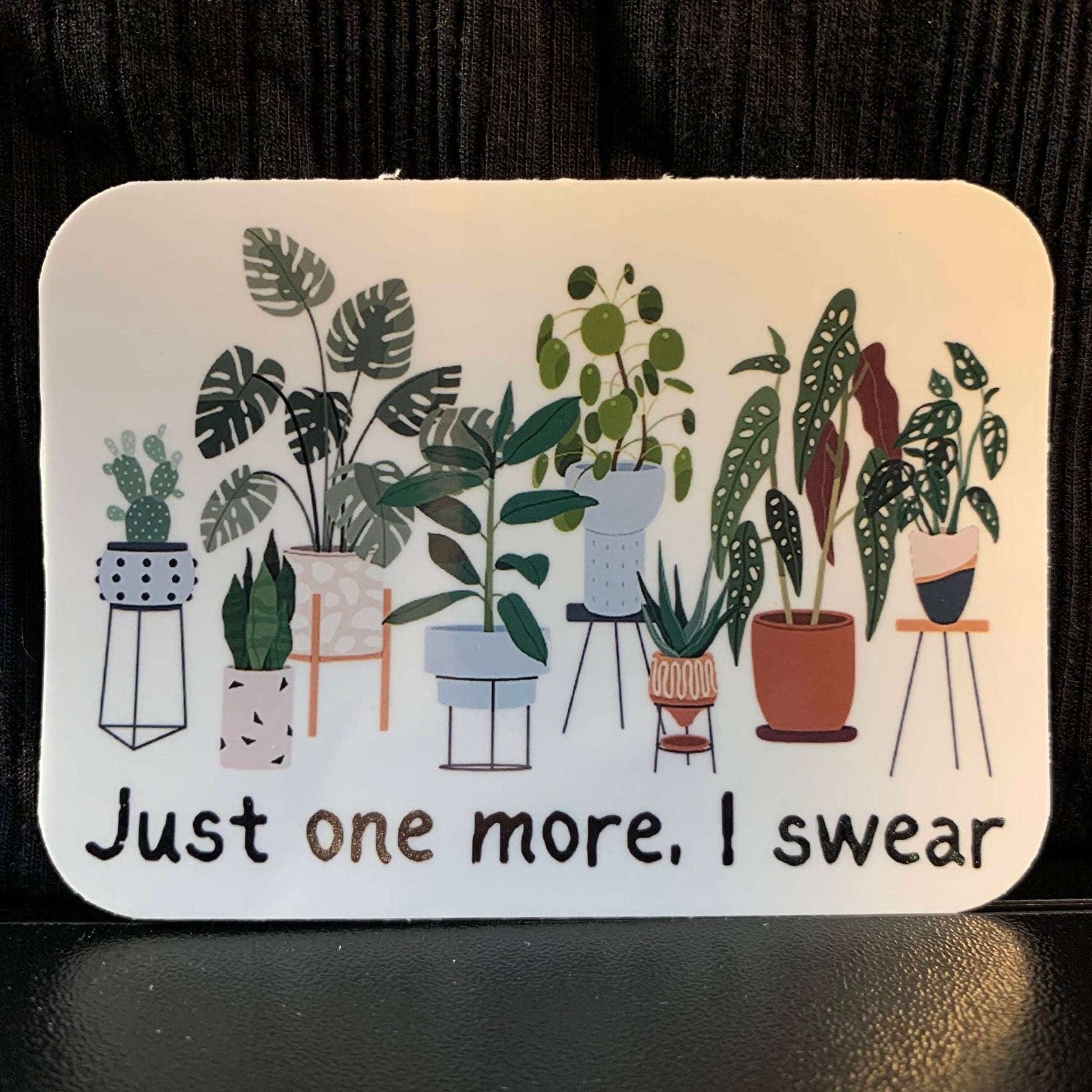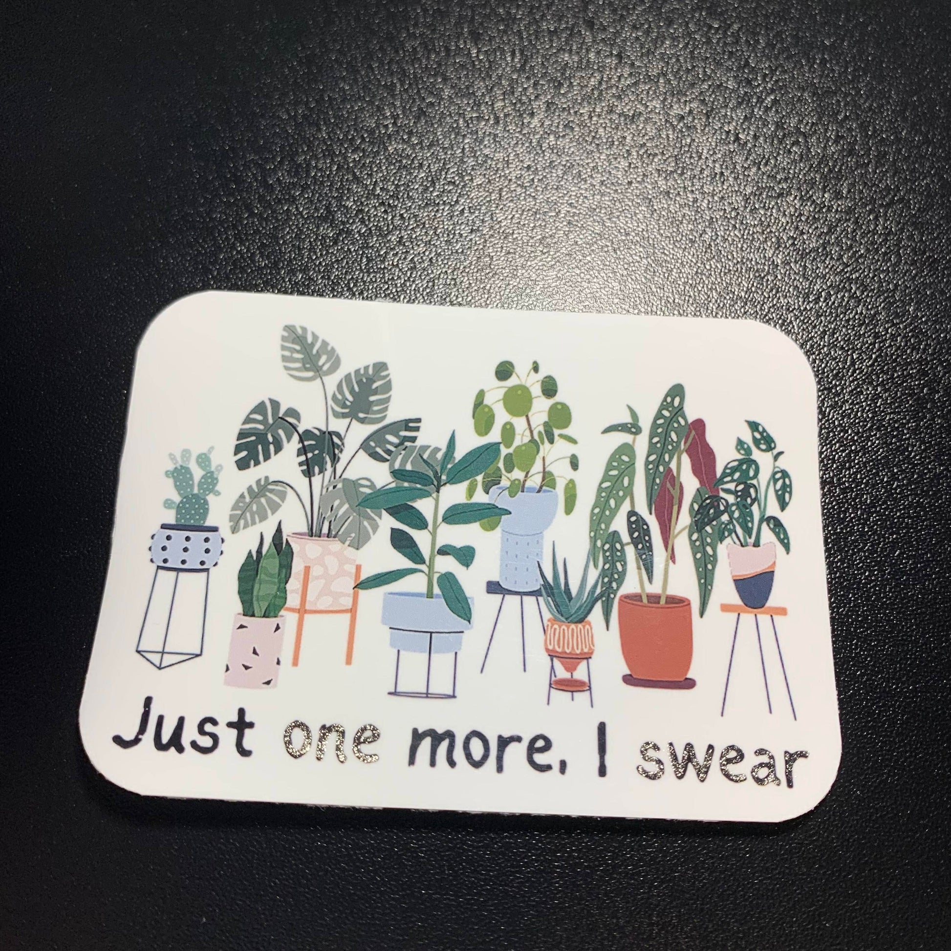 "Just one more, I swear" sticker perfect for plant hoarders lovers. Printed on waterproof vinyl with glitter detail.