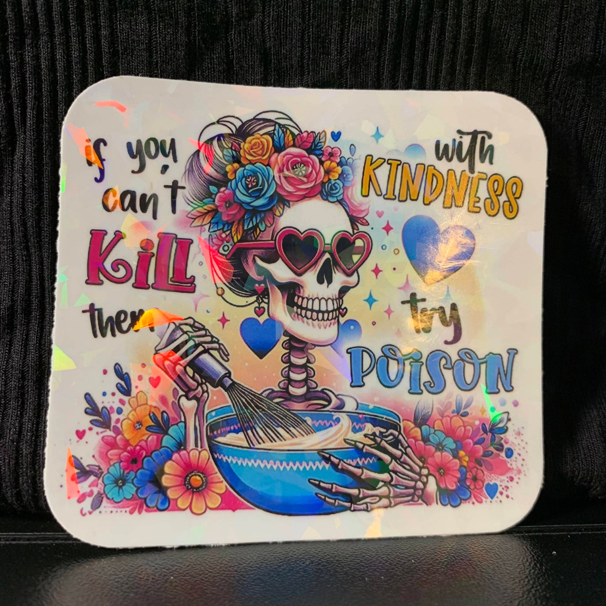 "If You Can't Kill Them with Kindness, Try Poison" sticker. Vinyl and waterproof with holographic crystal laminate.