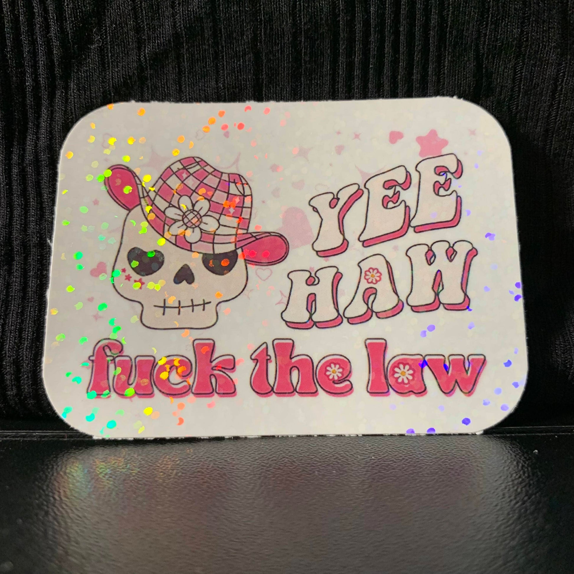 "Yee Haw Fuck the Law" sticker. Vinyl and waterproof with holographic glitter laminate.